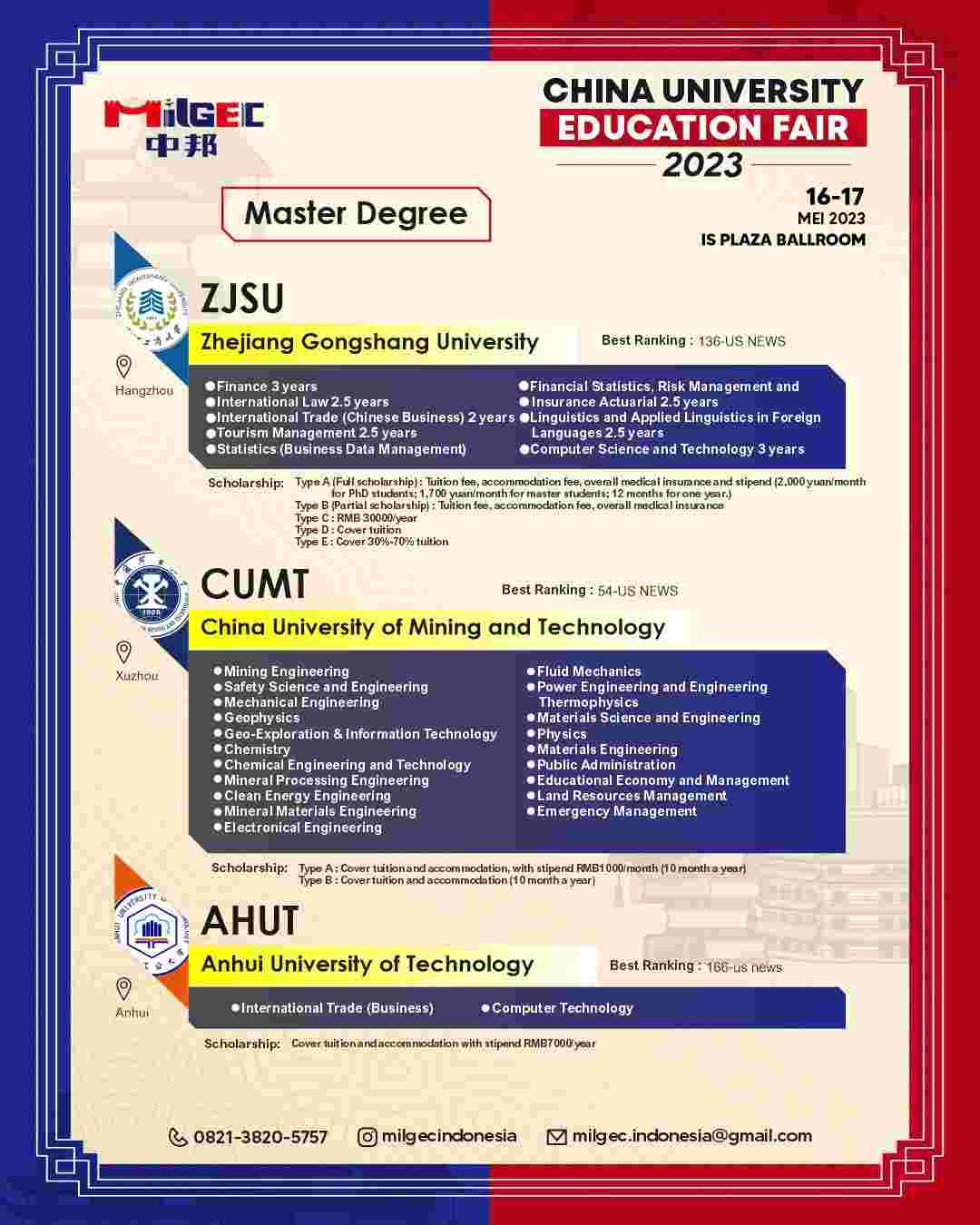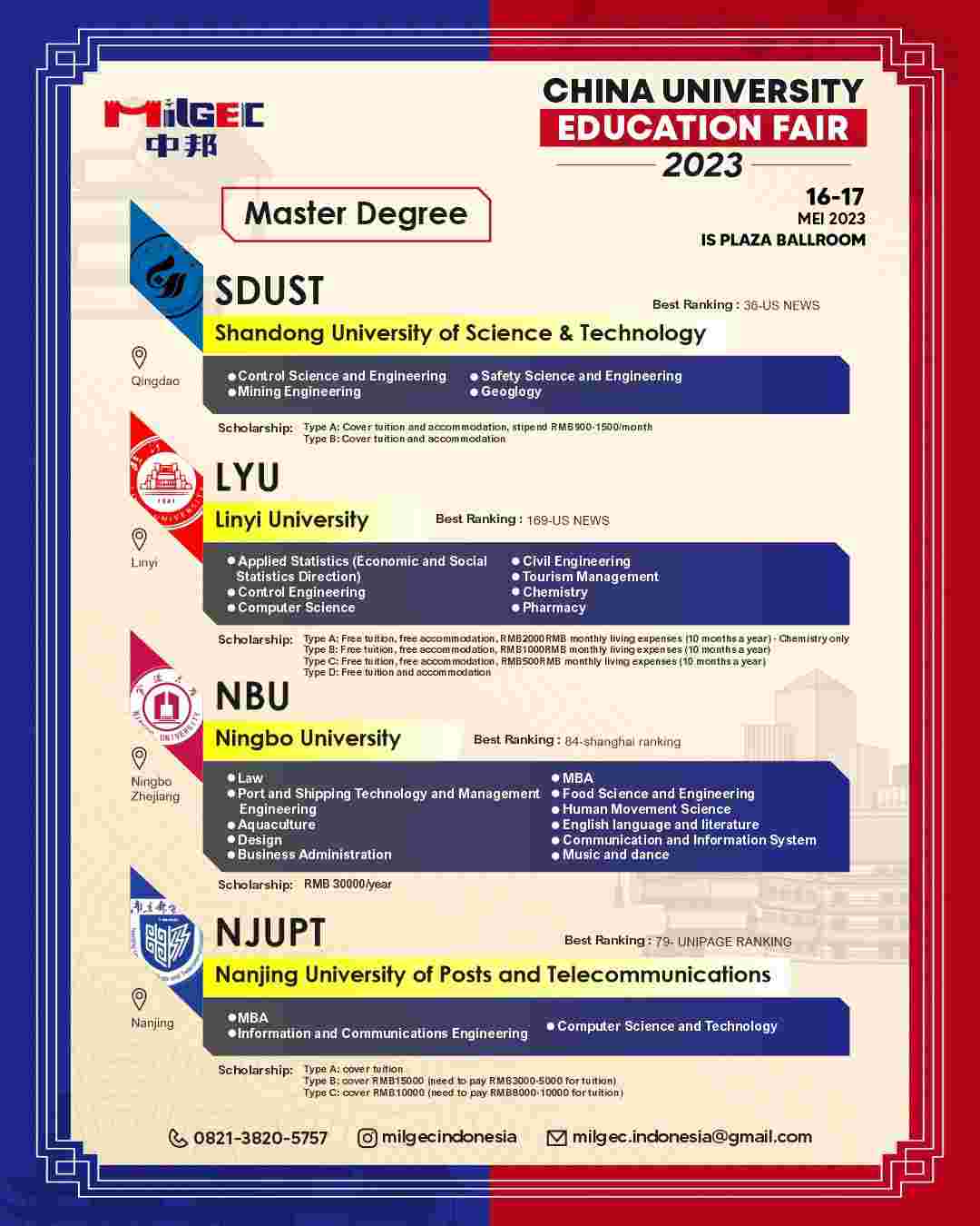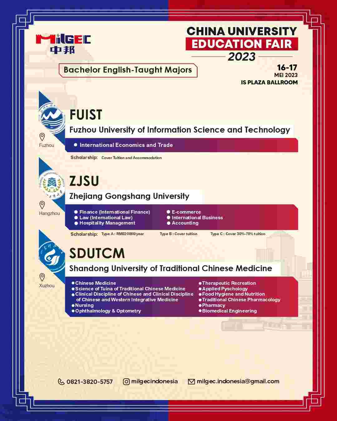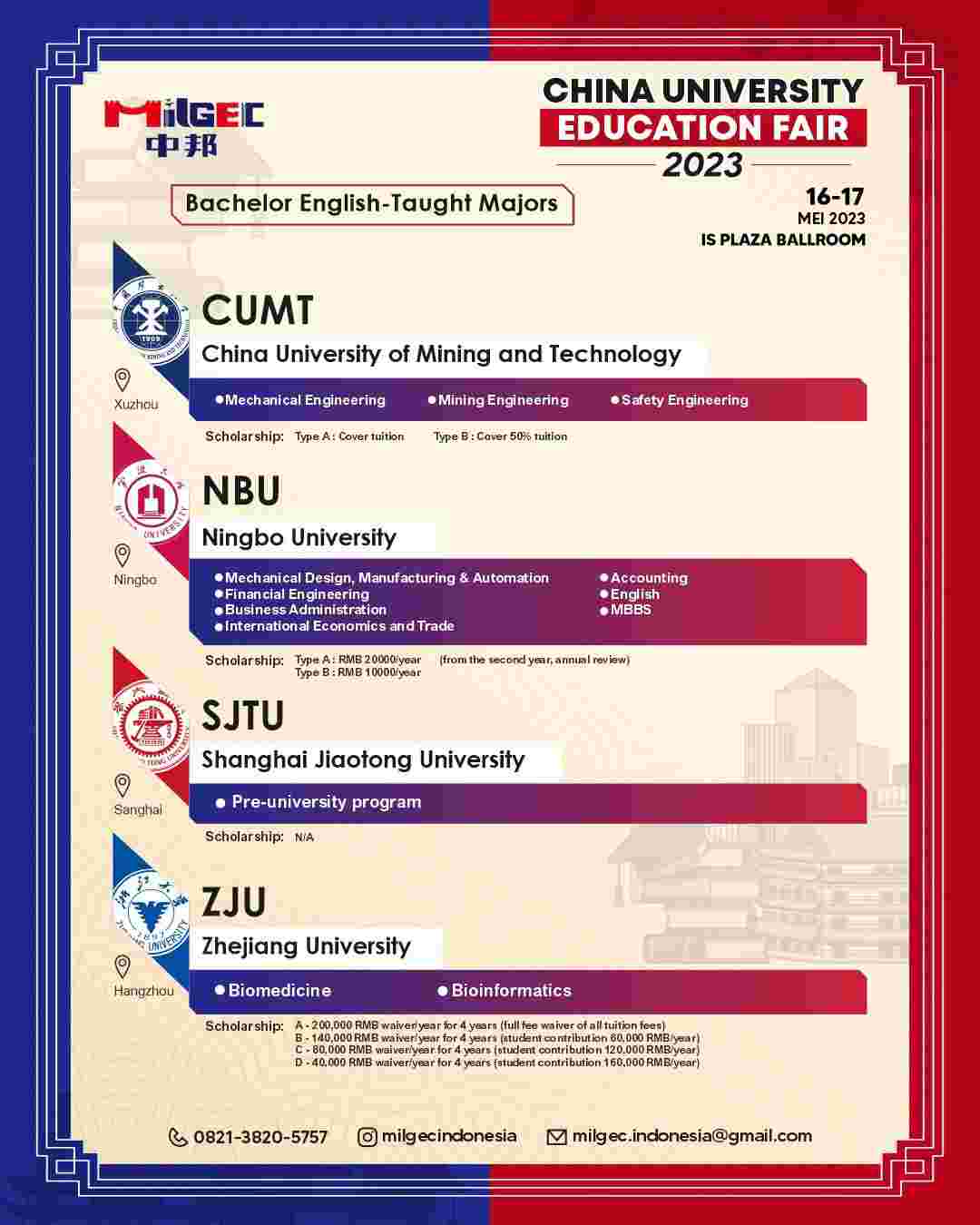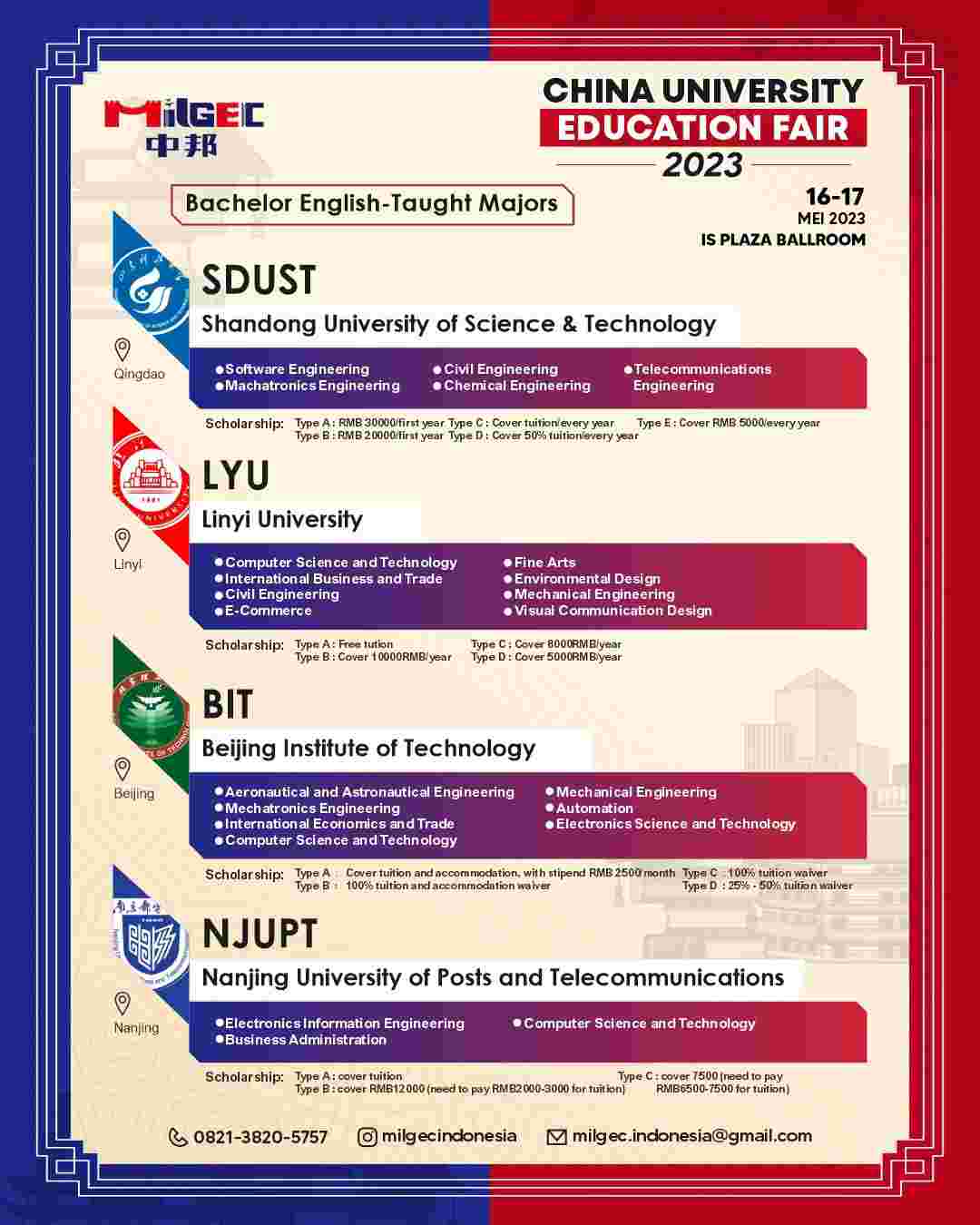 - Tersedia program beasiswa dengan pengantar Bahasa Inggris dan Mandarin