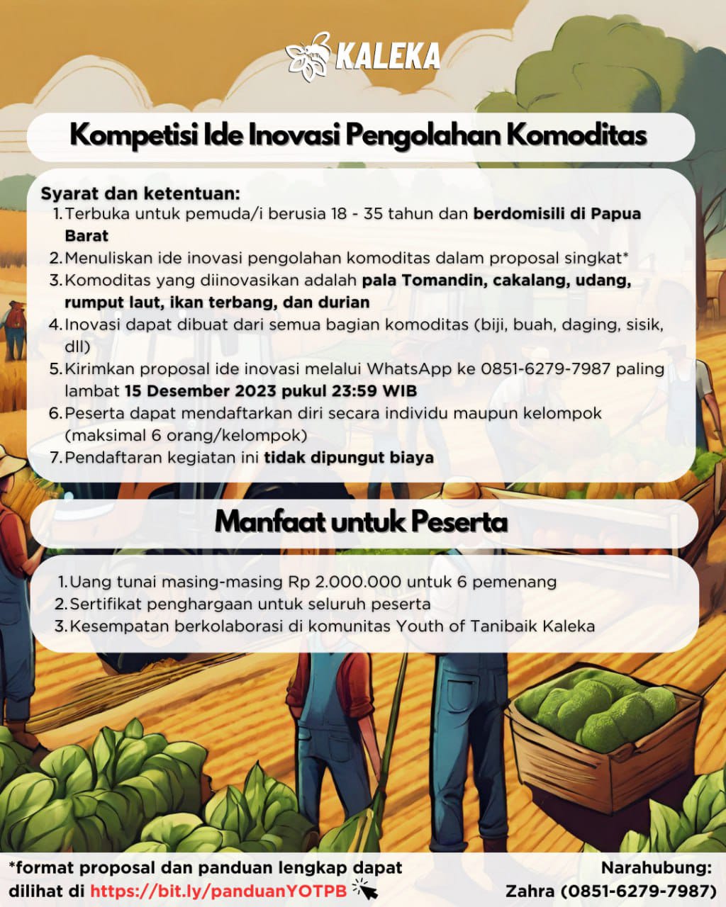 Untuk tata cara pendaftaran dapat dicek pada postingan di atas atau klik link bit.ly/panduanYOTPB . Apabila Sahabat Kaleka memiliki pertanyaan, dapat langsung menghubungi Minleka melalui DM atau hubungi narahubung berikut:
