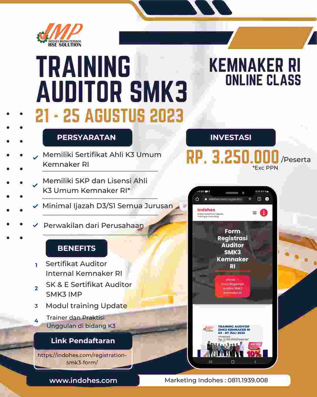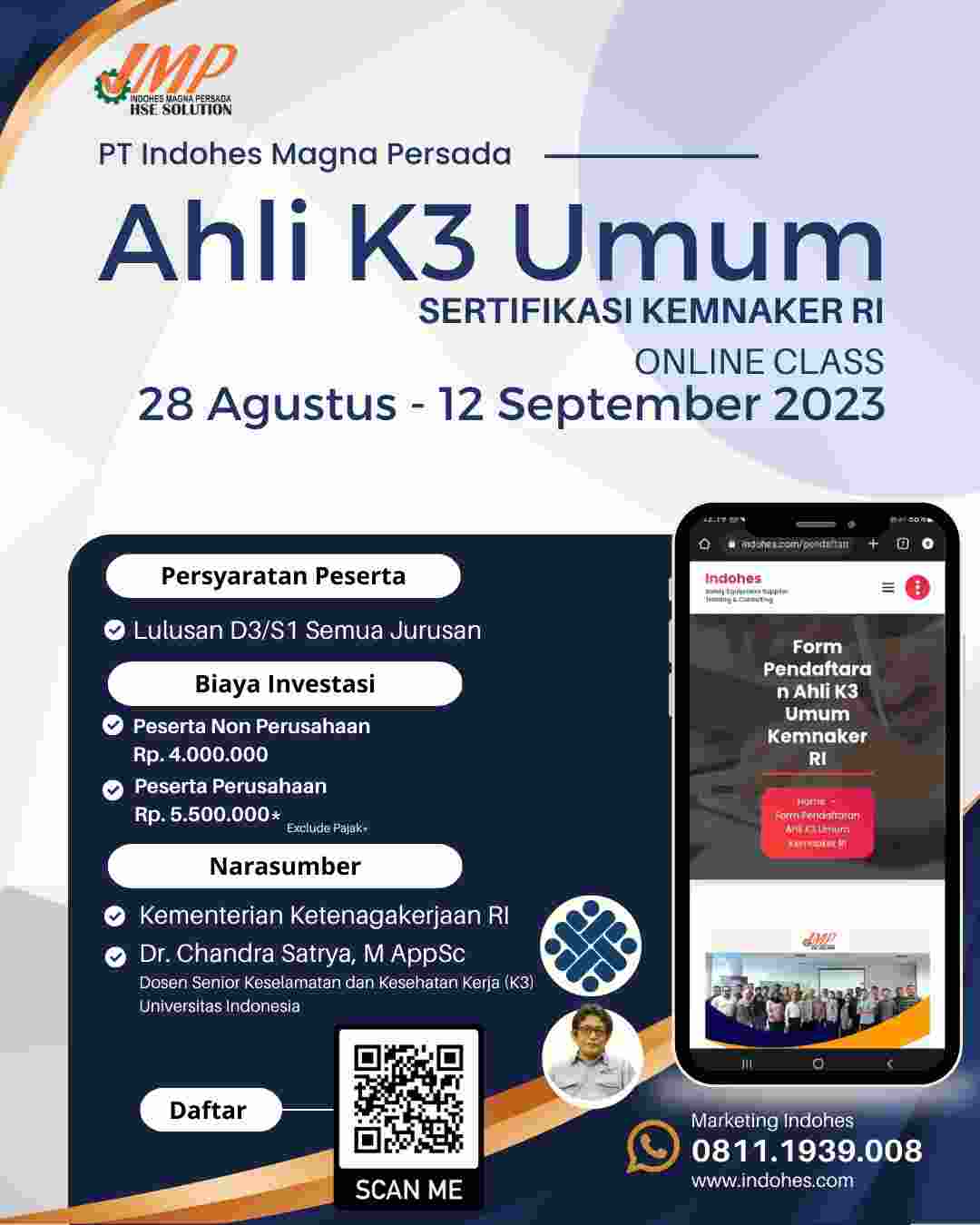 Perhatian semua profesional K3! Segera tingkatkan kompetensi dan keselamatan di tempat kerja dengan mengikuti Training Ahli K3 Umum Kemnaker RI yang akan diselenggarakan oleh PT Indohes Magna Persada.