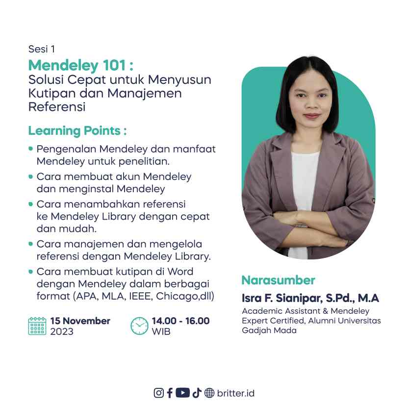 Mendeley 101: Kuasai dan pahami menyusun kutipan dengan cepat, atur strategi menghindari plagiarisme dan interpretasi Similarity Turnitin di webinar ini!