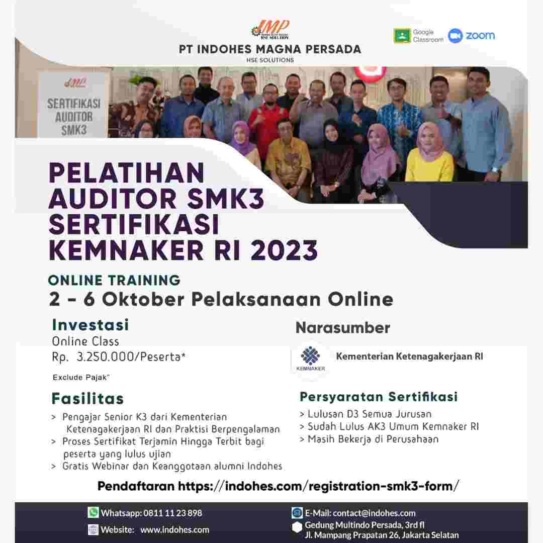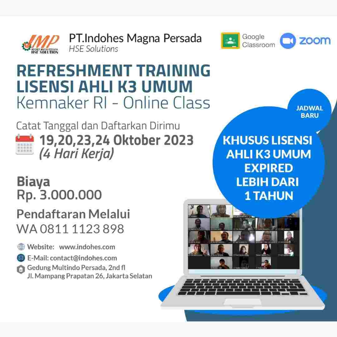 Hai para pejuang K3! Apakah Anda siap untuk mengambil langkah besar berikutnya dalam karier Anda? Kami dengan bangga mengumumkan Pelatihan Ahli K3 Umum yang akan diselenggarakan oleh PT Indohes Magna Persada pada tanggal 09 hingga 24 Oktober 2023.
