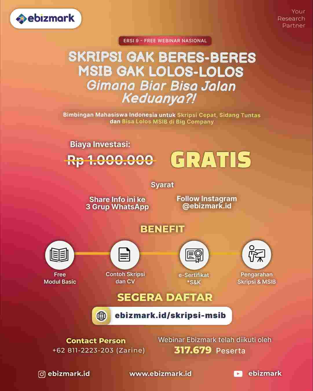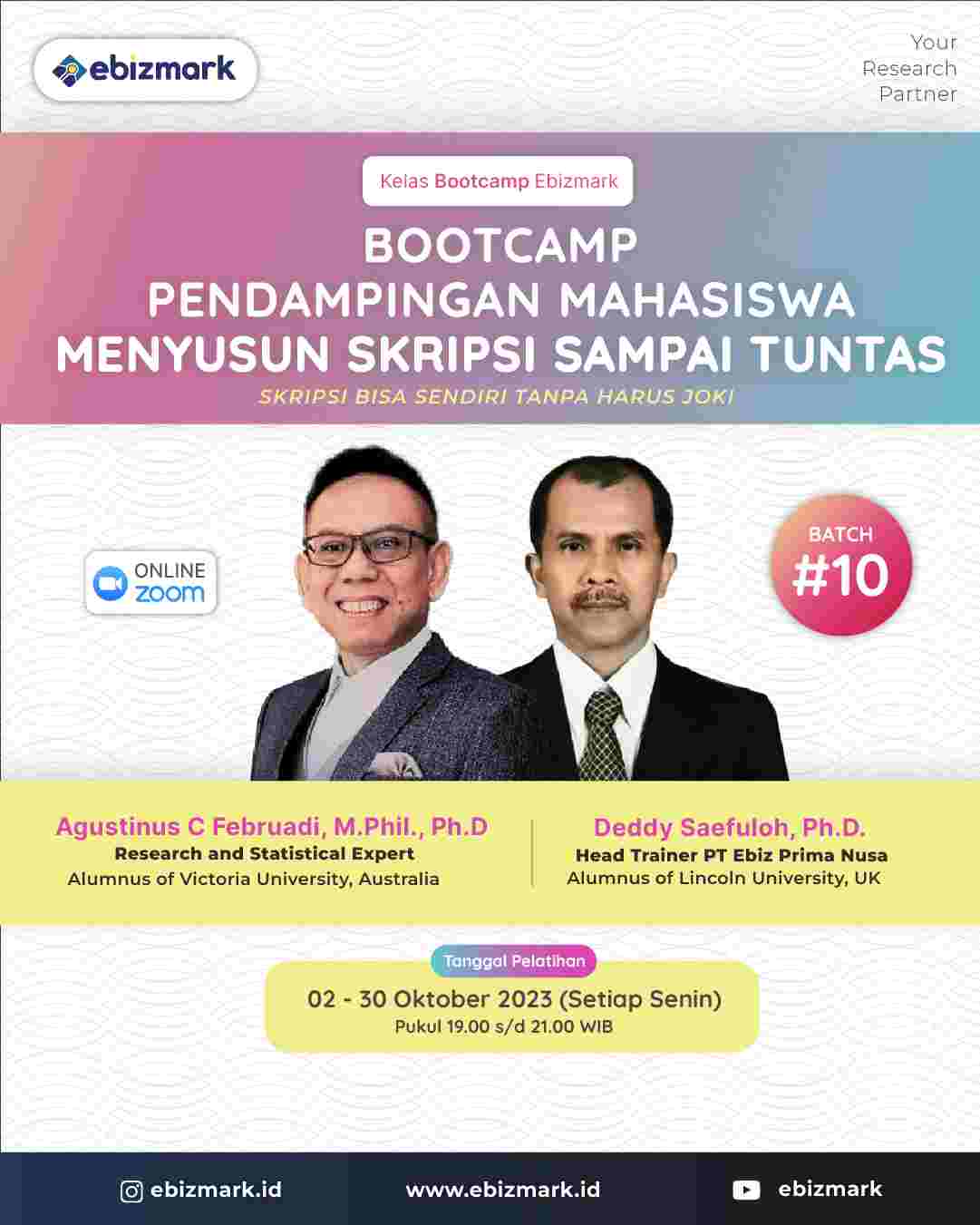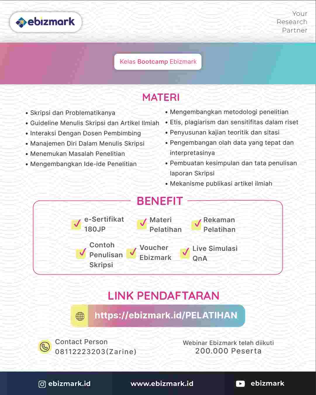 #Ebizmark #pelatihan #pelatihanskripsi #pelatihanonline #bootcamp #penulisan #artikel #skripsi #tesis #disertasi #jurnal #kualititatif #kuantitatif #penelitian #jurnalsinta #jurnalnasional #publikasi #webinar #webinarnasional #webinargratis #plagiarisme #webinarplagiarisme #turnitin #parafrase