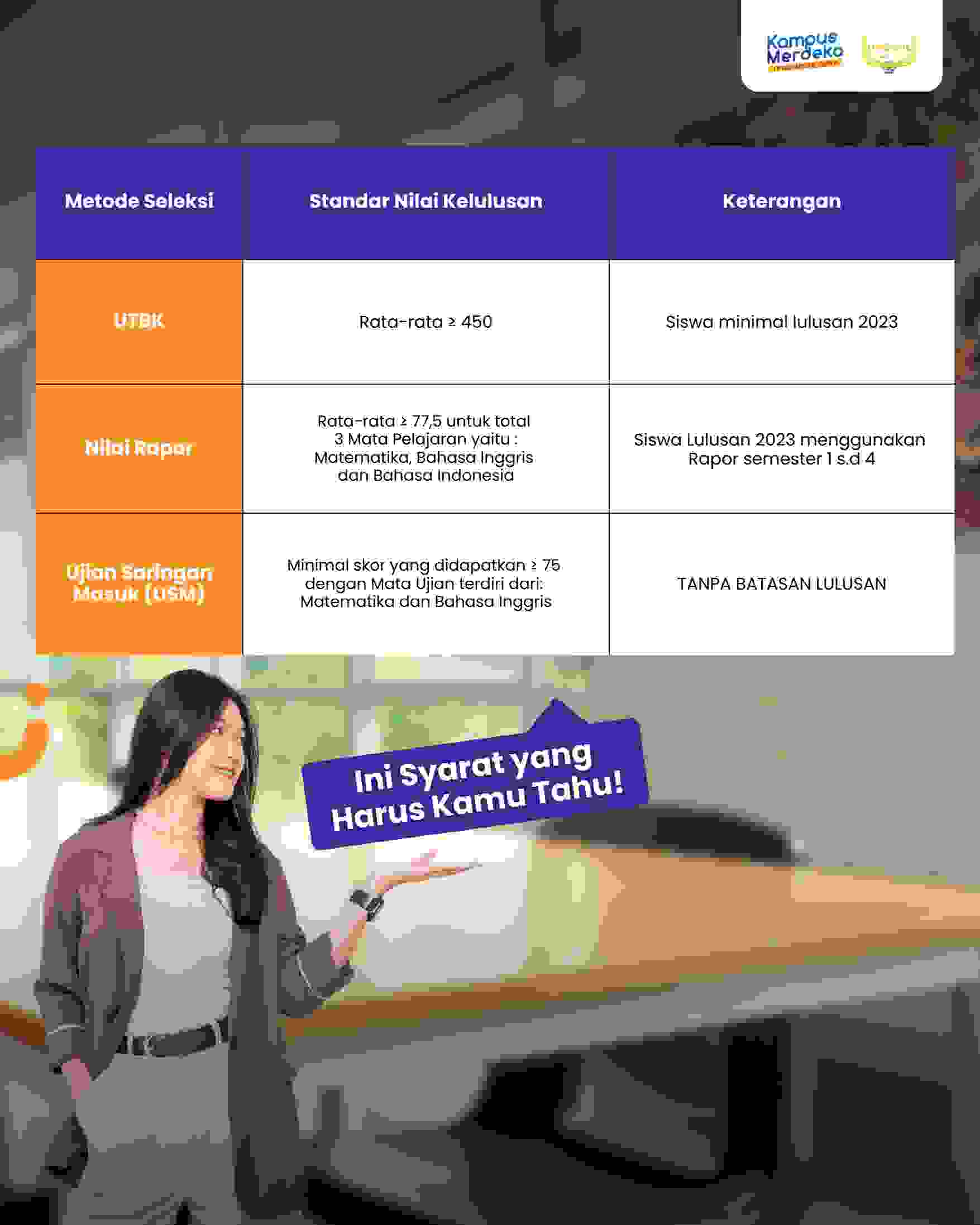 - Nilai Rapor : Rata-rata ≥ 77,5 untuk 3 Mata Pelajaran